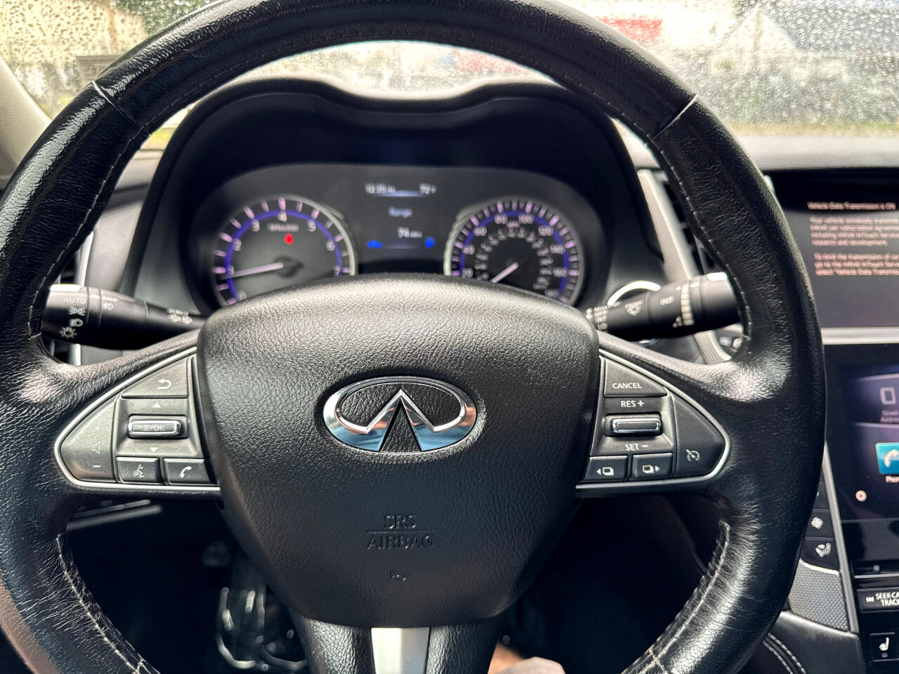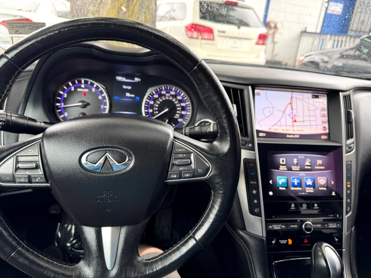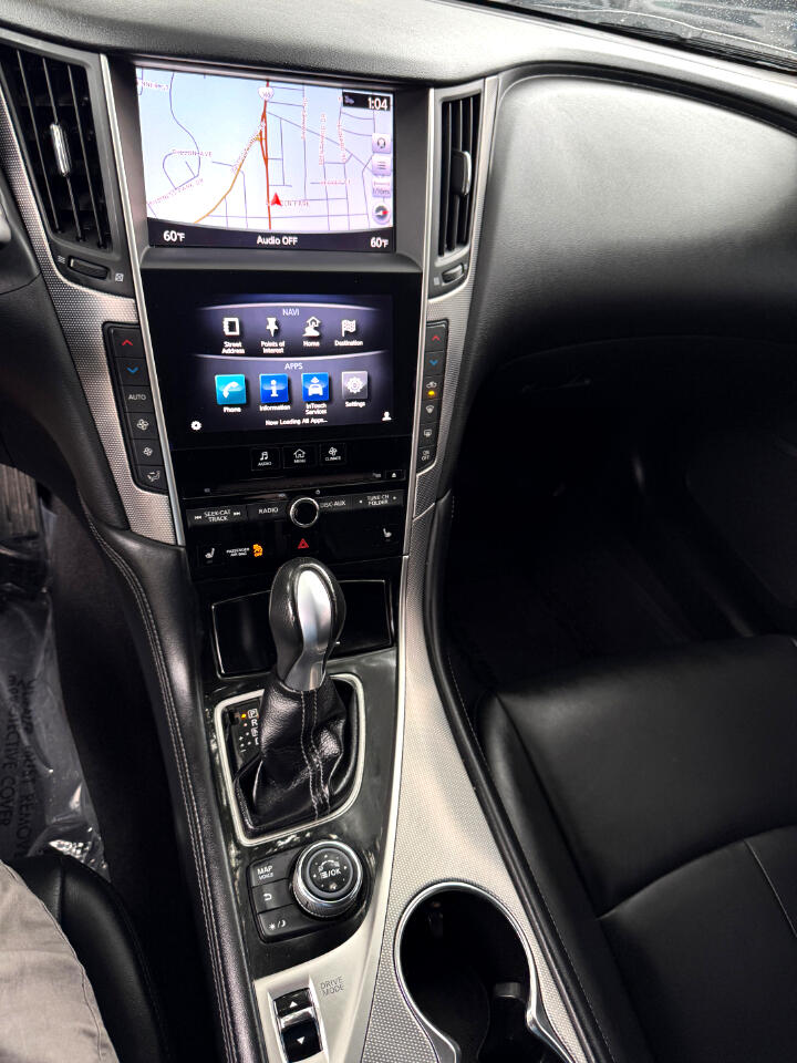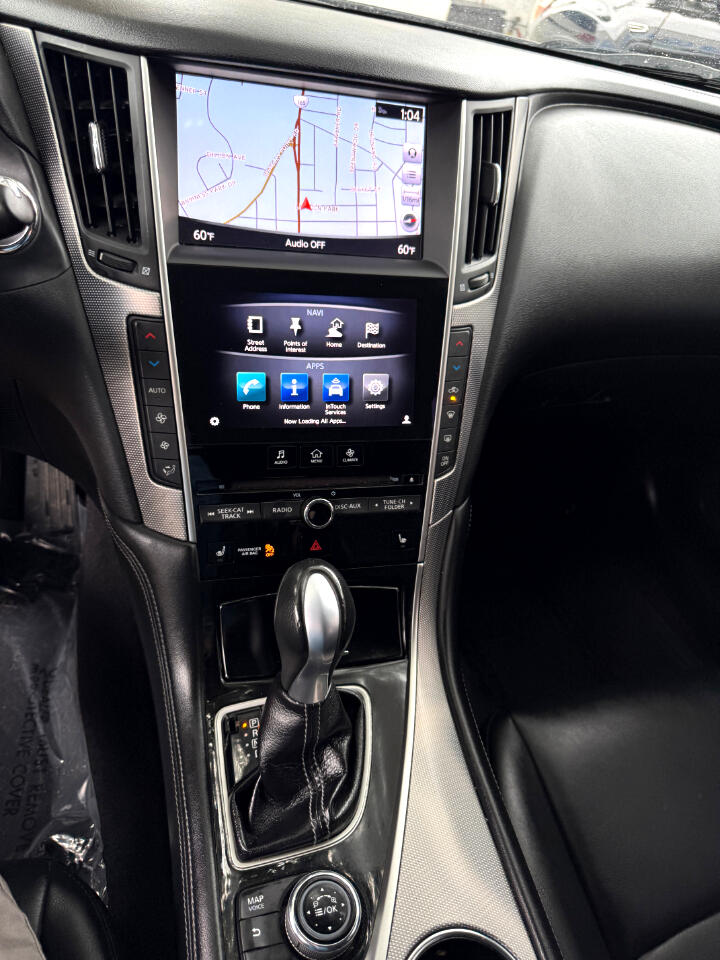 Step inside the plush interior and be greeted by leather-trimmed seats that provide both comfort and style. The dual-zone automatic climate control keeps you and your passengers in perfect harmony no matter the weather outside. With convenient features like a power sunroof for those sunny days, a HomeLink garage door transmitter for easy access, and Bluetooth connectivity for seamless music streaming, this Q50 is designed to cater to your every need.
