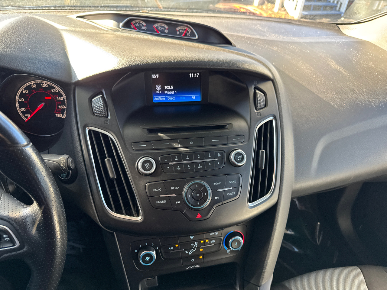 Inside, you'll find a comfortable interior with a leather steering wheel and chrome accents. The front seats are adjustable for your comfort, and the rear bench seat flips forward for additional storage space. Cruise control, a compass, and a rearview camera are just a few of the convenient features that come standard in this Ford Focus.